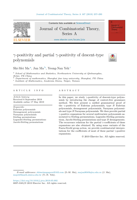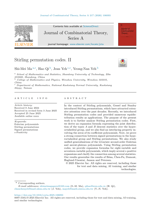 近日,我院图论与组合团队在国际权威数学期刊《Journal of Combinatorial Theory, Series A》上发表了题为“Eulerian-type polynomials over Stirling permutations and box sorting algorithm”的研究论文。我院马世美教授为论文的第一作者兼通讯作者。