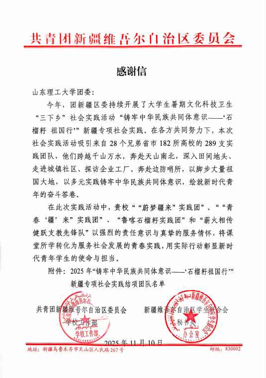 近日,共青团新疆维吾尔自治区委员会向山东理工大学团委发来感谢信,对校相关实践团在2025年“铸牢中华民族共同体意识——‘石榴籽・祖国行’”新疆专项社会实践中的突出表现予以表彰。
