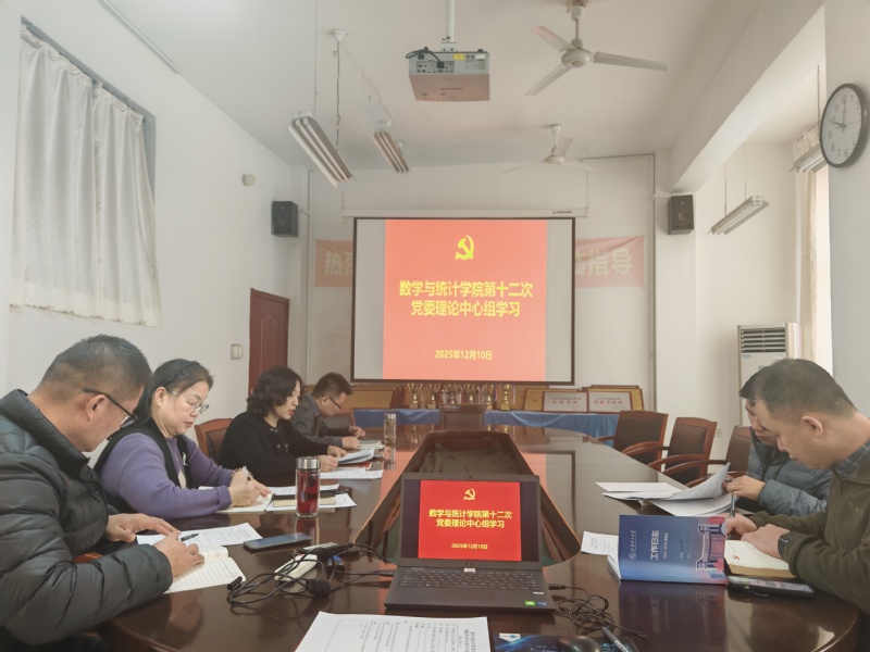 2025年12月10日上午,数学与统计学院党委在15号教学楼414会议室组织召开2025年度第12次理论学习中心组学习会议。会议由学院党委书记郭奎霞主持,理论学习中心组成员参加。