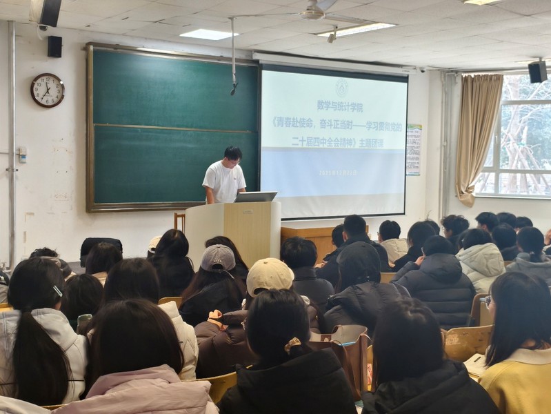 为引导青年学生深刻领会党的二十届四中全会精神内核,将青春理想锚定时代发展方向,12月22日,数学与统计学院开展“青春赴使命,奋斗正当时——学习贯彻党的二十届四中全会精神”主题团课,本次团课由赵文龙老师主讲,学院各团支部团员、学生骨干共80余人参与学习。