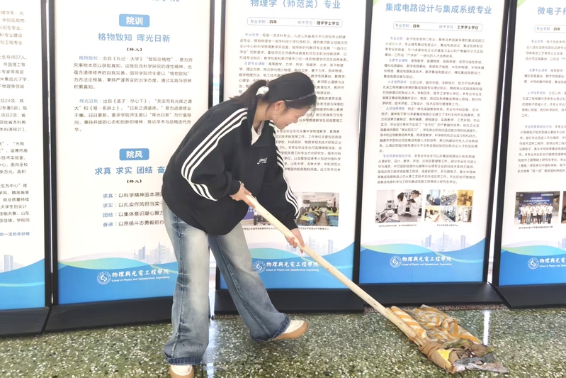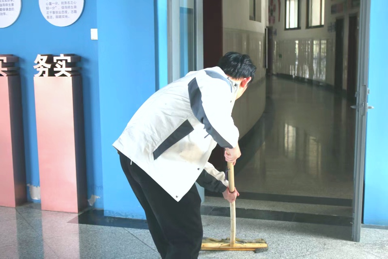 本次劳动教育实践活动在15号教学楼开展,学院以小组为单位精准划分责任区域,明确各岗位劳动任务。活动覆盖教室、走廊、楼梯等多个区域。其中,教室清洁组负责讲台除尘、窗台擦拭、地面清扫及垃圾清运等任务;公共区域工作组负责走廊、楼梯台阶及扶手的清洁工作,确保教学秩序稳定与环境卫生整洁双线并行,为全院师生营造清洁整齐的学习环境。