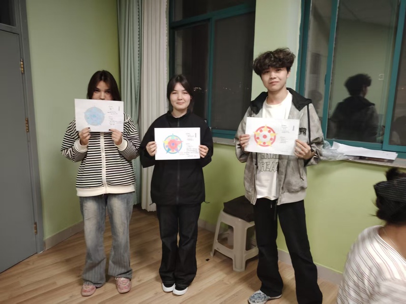 创作环节后,进入分享交流环节。同学们轮流上台展示自己的曼陀罗作品,讲述色彩选择背后的心境故事、图案设计中蕴含的成长感悟。从线条的疏密到色彩的搭配,从创作时的心情变化到对自我状态的新认知,每一次分享都是一次真诚的自我袒露,每一次倾听都是一次温暖的情感共鸣。台下的同学认真聆听,以掌声传递鼓励,以共情回应心声,不同民族的文化底色在交流中交融,多元的心灵感悟在分享中汇聚,形成了“各美其美、美美与共”的温暖氛围。活动现场不时响起阵阵掌声与欢声笑语,心与心的距离在交流中悄然拉近,班级凝聚力与向心力也在互动中不断增强。