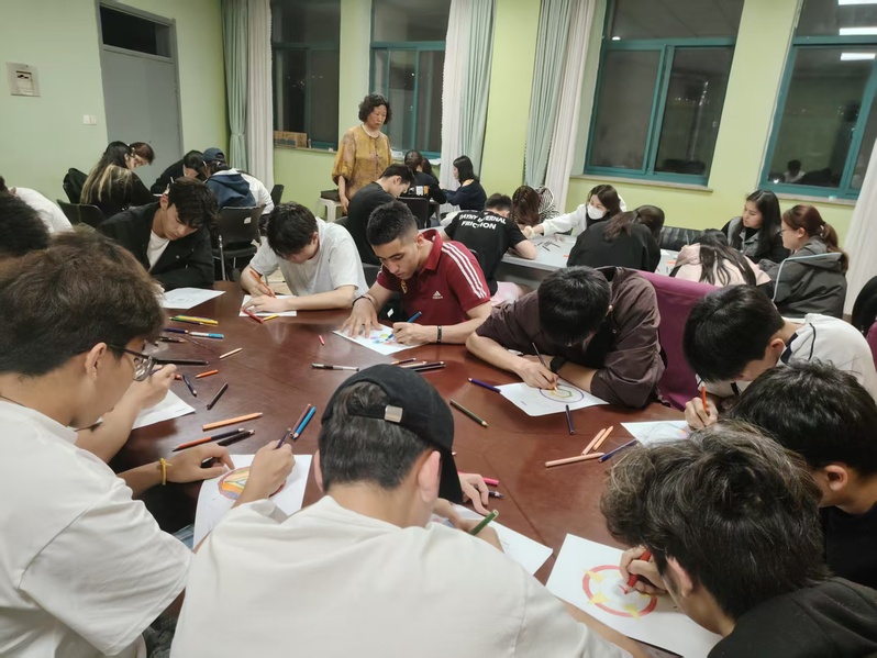 活动现场,温馨柔和的氛围驱散了同学们的拘谨。在心理指导老师的引导下,同学们围坐桌前,手握彩笔,在曼陀罗模板上自由涂画。色彩在纸上晕染,情绪在笔尖流淌,原本抽象的心情被具象化为斑斓的图案,或热烈明快,或沉静内敛,每一幅作品都是内心世界的独特投射。绘制过程中,同学们全神贯注,在专注创作中卸下压力、平复情绪,在色彩表达中探索自我、接纳自我。